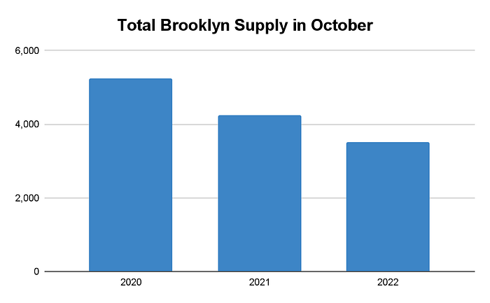 Month-over-month, total supply increased modestly to 3,474 units and new listings, 834, were down –12% as we would expect historically. new listings that were uploaded during September. We can expect a bump in those numbers again next month since, historically, October is the high mark of supply. Brooklyn inventory is still well shy of the record high reached in 2020 as uncertainty prompted increased listing activity and significantly lower, too, than 2021 as sellers leveraged record demand.