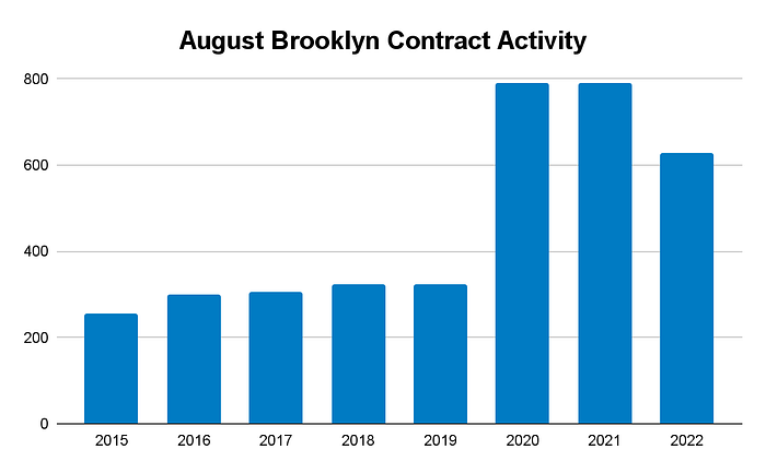 Brooklyn Buyer Activity, as measured by signed contracts, increased 10% compared to July as 628 contracts signed in August. Compared to August 2021, 20% fewer contracts were signed this year. Despite the decline in contract volume compared to last August, this year’s contract volume remains well above the average in August of 2015 through 2019.