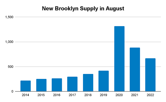 Brooklyn Supply decreased by 8% in August compared to July, lowering the total supply to 3,227 units for sale. In August, 666 new listings came to market, which is less than came to market in August 2020 and August 2021, but above average compared to the volume of new-to-market supply in August of 2014 through 2019.