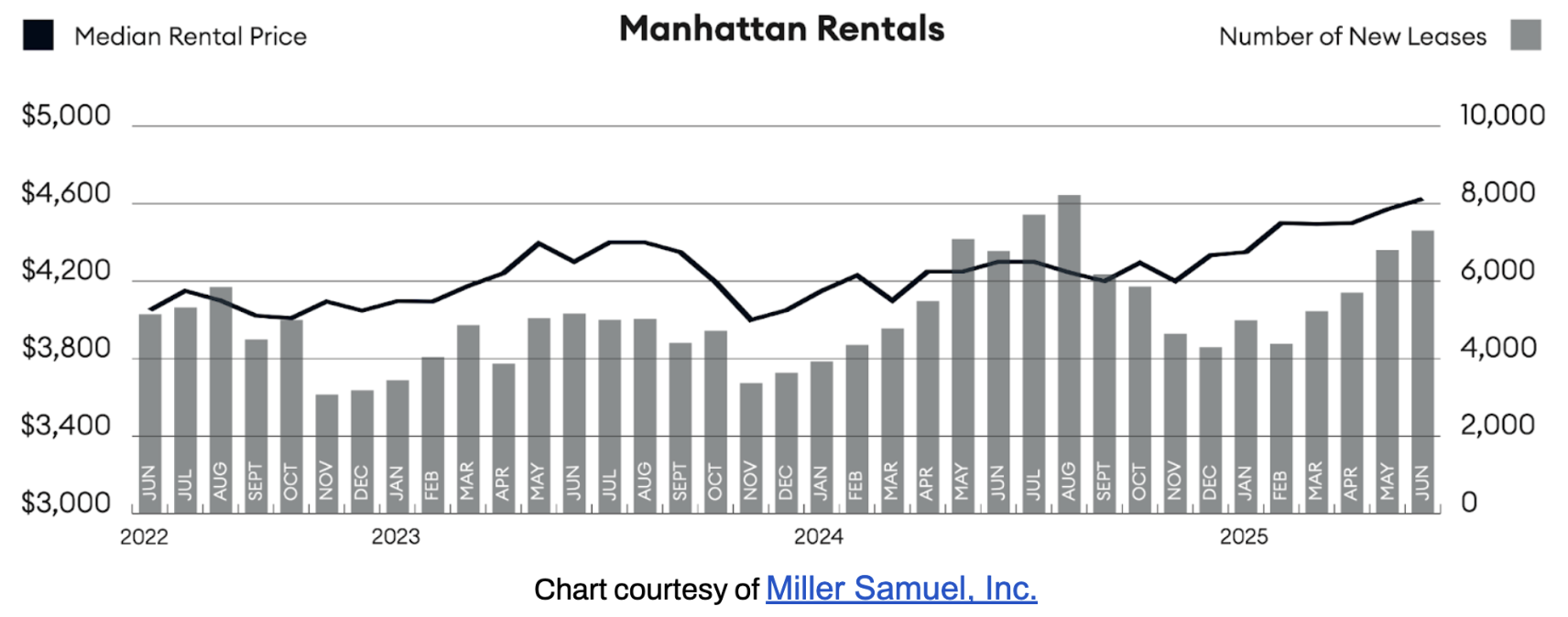 Manhattan median rent hit $4,625 in June, a new record. That’s a 1.2% increase from May and 7.6% year-over-year. Lease activity remains high, with one in four deals closing above the last asking price.³