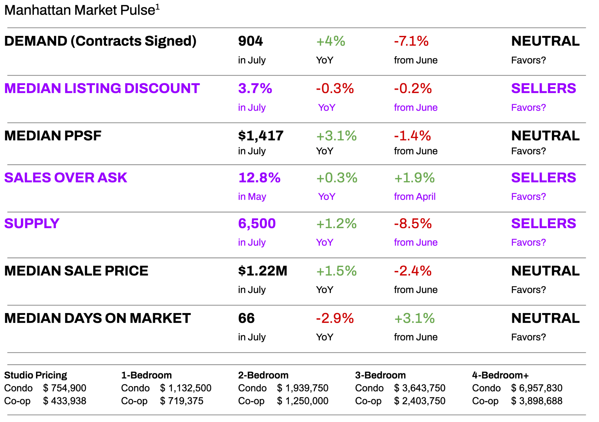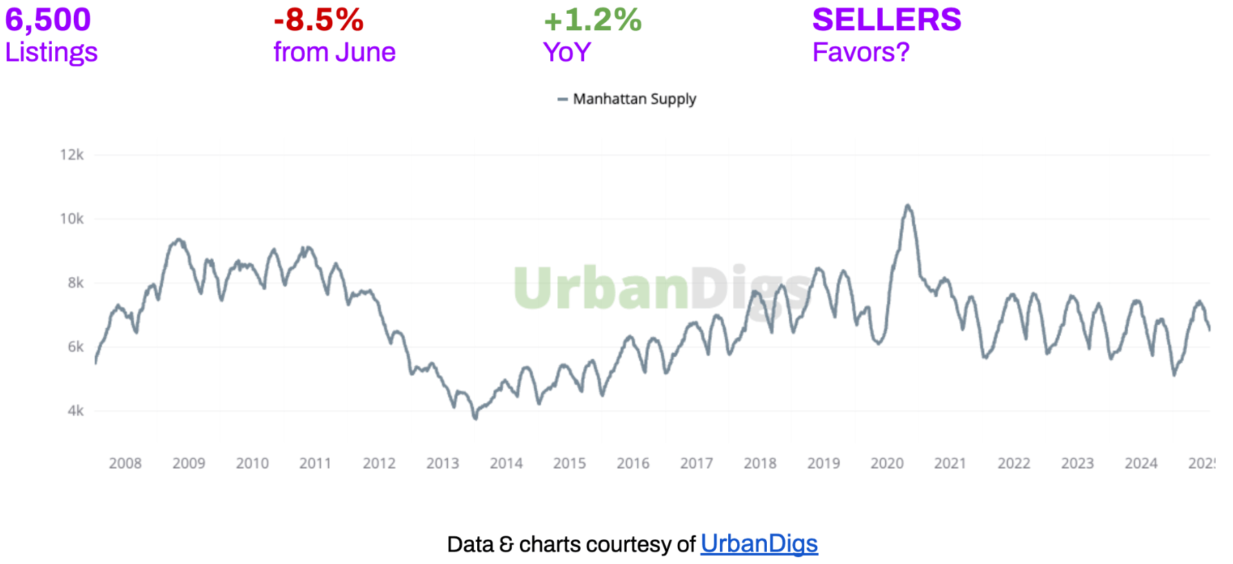 Sellers continued to benefit this summer in Manhattan, as many late-spring contracts reached the closing table in July—especially in the investor and cash-heavy segments. As expected, July and August reflect a seasonal slowdown, with lighter buyer activity typical of the vacation months.