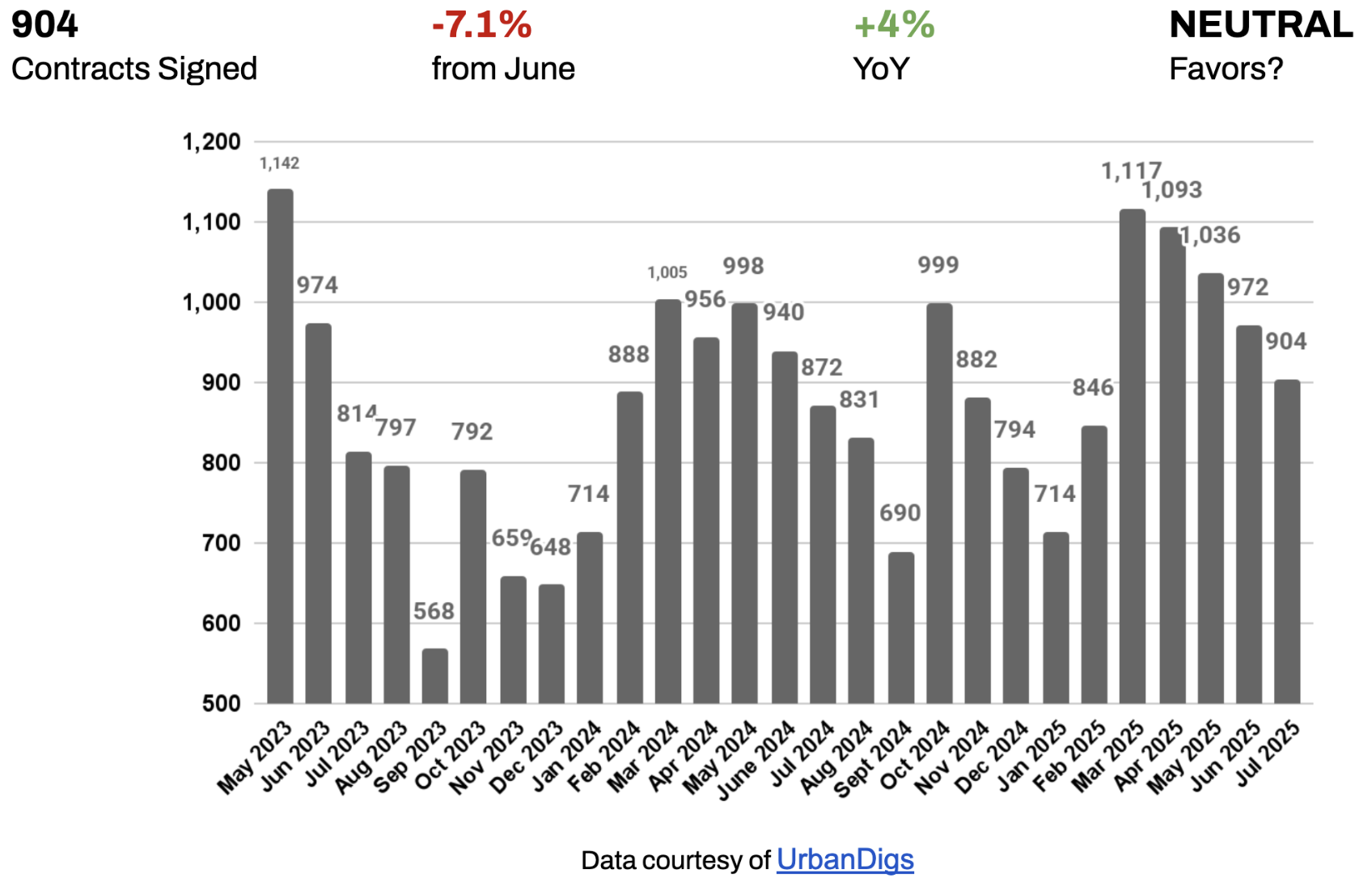 904 contracts were signed in July, down 7.1% from June but up 4% from last year. While the pace slowed, buyer activity remains strong relative to 2024, especially at the high end.