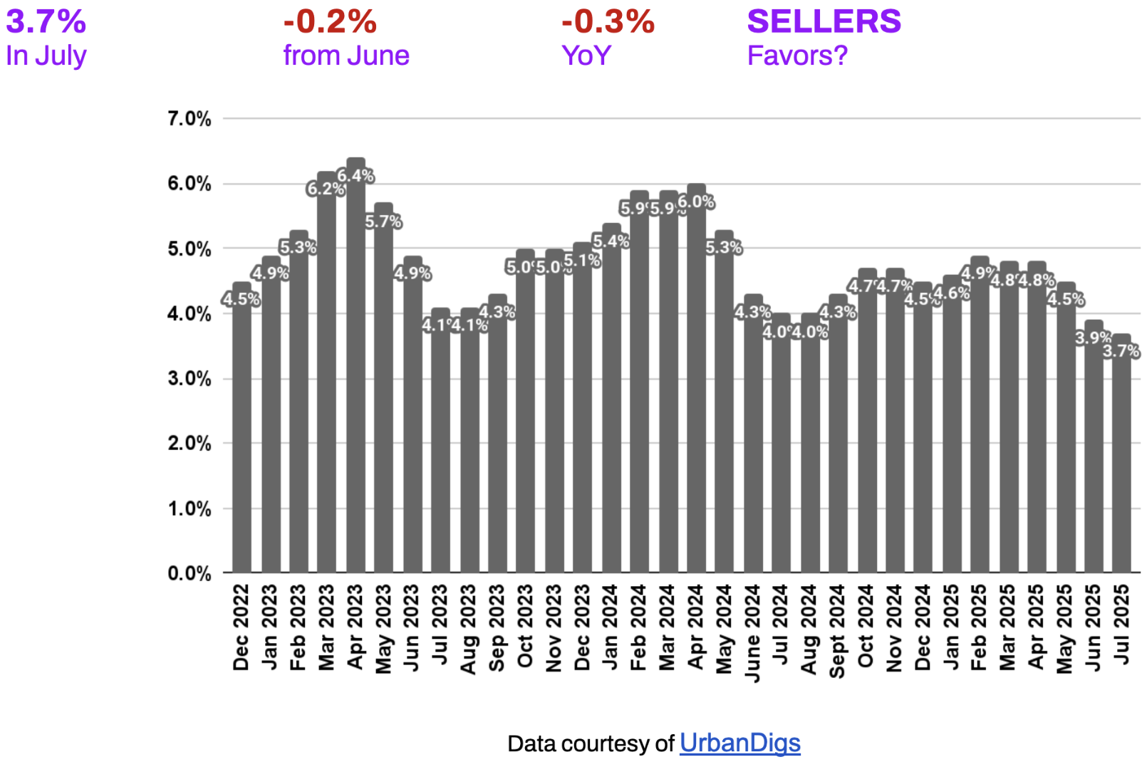 Listing discounts narrowed again to just 3.7%, down from 3.9% in June. This marks the fourth straight month of compression, indicating that sellers are pricing smarter and buyers are willing to meet expectations.