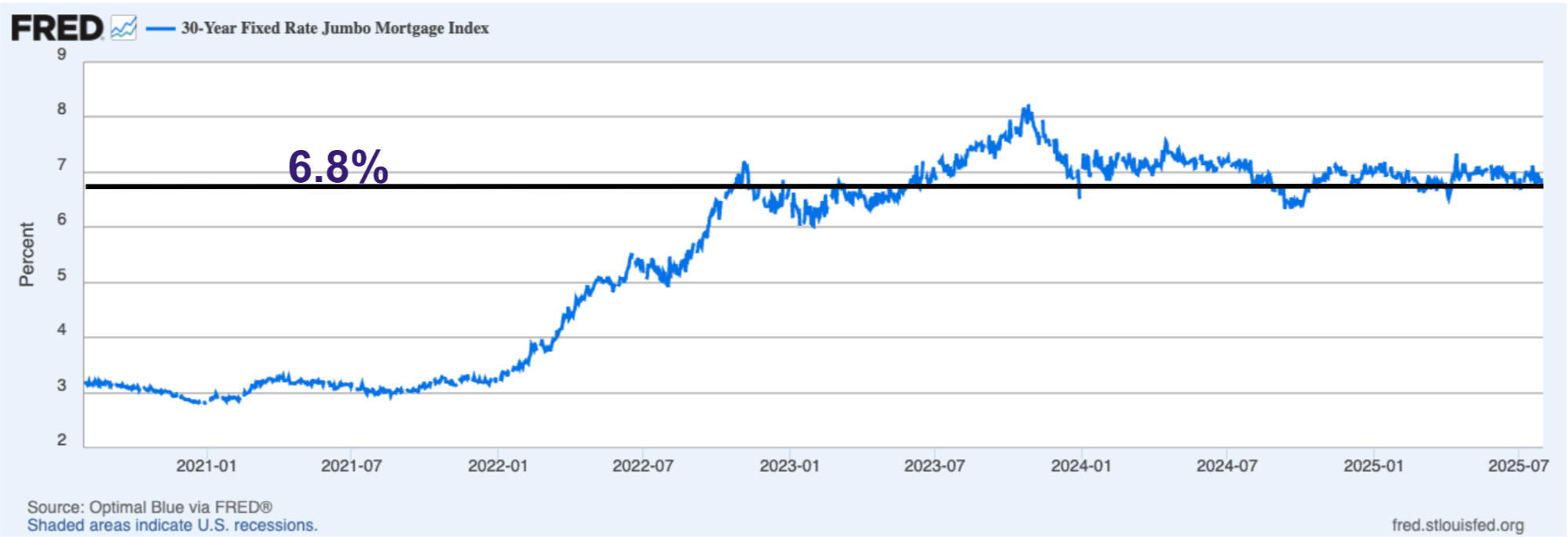 Jumbo 30-year fixed mortgage rates rose to 6.8%⁴ in July, with average APRs near 6.6%⁵. These elevated rates are no longer a surprise and have largely been absorbed into buyer behavior.