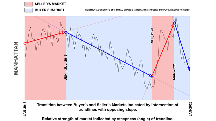 Elegran’s Leverage Indicator informs us whether the current is a buyer’s or a seller’s market; i.e, which party possesses transactional leverage. Looking at the graph below, this is indicated by the direction of trendlines. Our indicator also informs us regarding the relative strength of that leverage, indicated by the slope of those trendlines. Per below, Manhattan is in the grips of a strong buyer’s market.