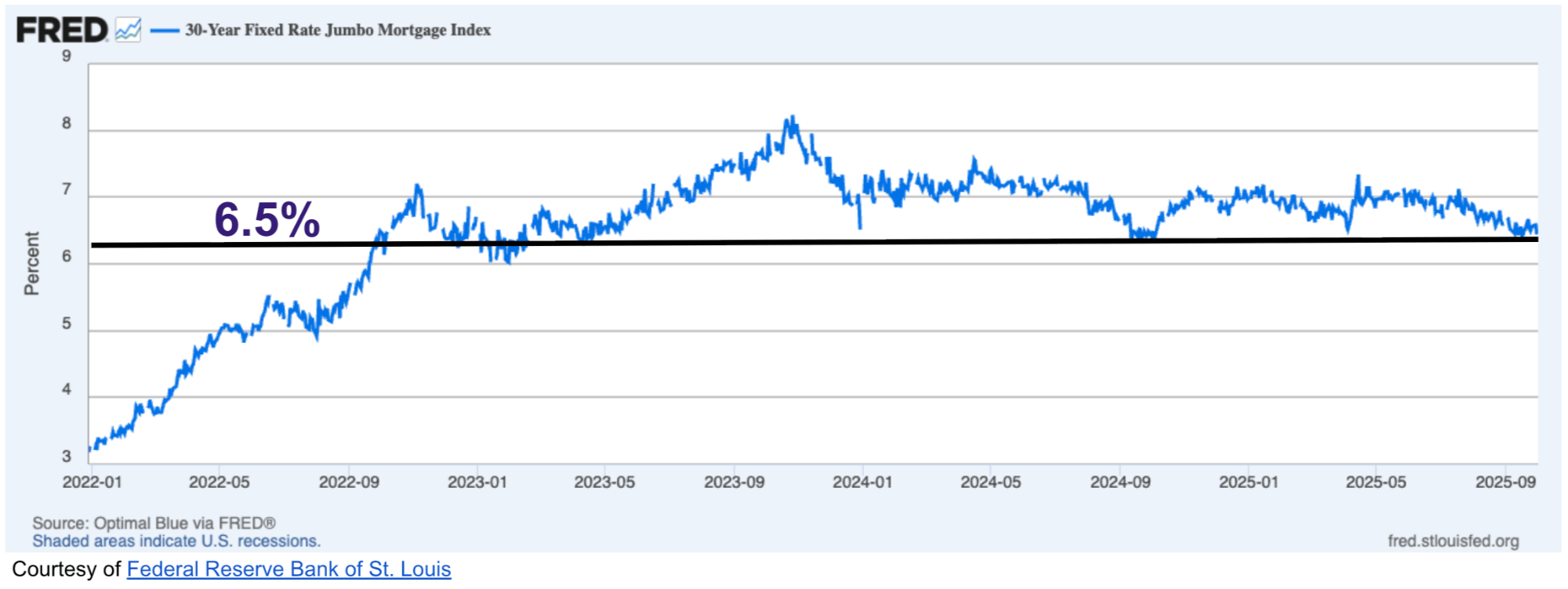 Financing a home purchase remains considerably more expensive than it was a few years ago, but there are signs that the worst may be behind us. As of early October 2025, 30-year fixed jumbo mortgage rates (which many Manhattan buyers rely on, given high purchase prices) are hovering around 6.5%⁴, with average APRs in the low 6%⁵ range. These figures are roughly on par with where rates stood for most of the summer, and actually a hair below the peaks seen in mid-2025 when some jumbo quotes touched 6.8–7%. In other words, mortgage rates have plateaued, establishing a new normal in the mid-6s for now.