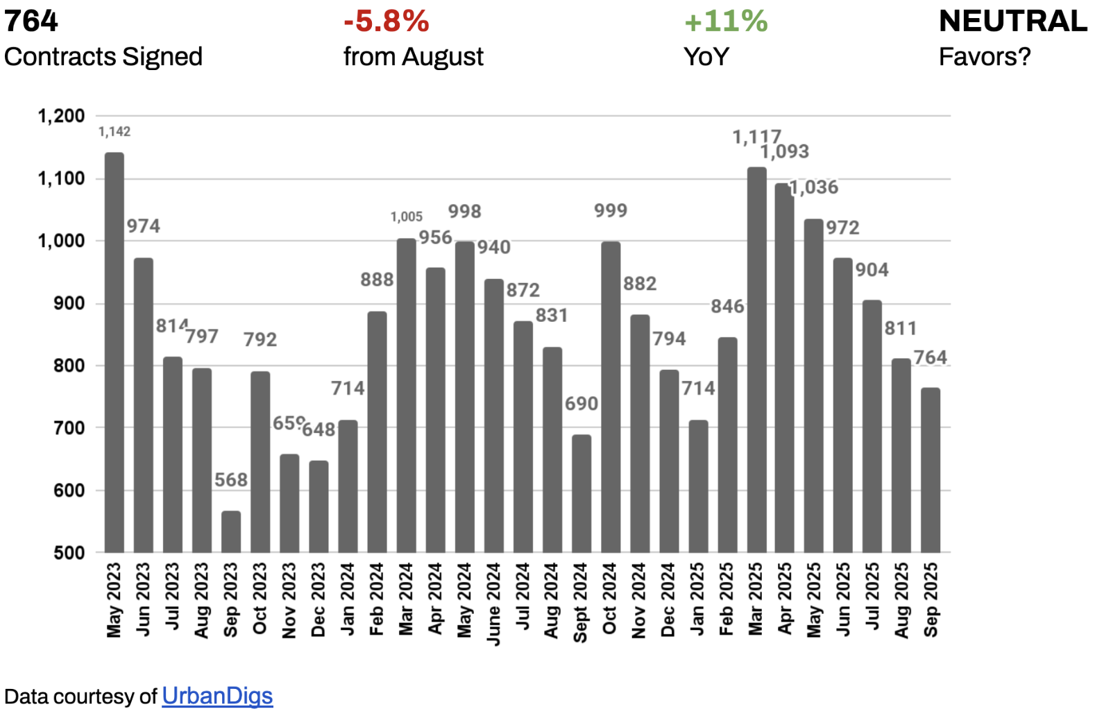 In September, three of the four key levers tipped toward buyers: supply jumped by more than 20%, median prices per square foot softened, and listing discounts ticked higher. Demand, however, held steady, with contract signings slightly below August but still stronger than a year ago. The result? A clear shift toward a buyer-leaning market.