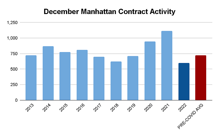 As noted previously, demand for Manhattan residential real estate has been trending below its historical average. The graph below illustrates this insight, as this December posted the fewest contracts signed during the 10-year period observed.