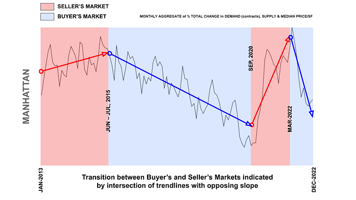 Elegran’s Leverage Indicator informs us whether the current is a buyer’s or a seller’s market; i.e, which party possesses transactional leverage. Looking at the graph below, this is indicated by the direction of trendlines. Our indicator also informs us regarding the relative strength of that leverage, indicated by the slope of those trendlines. Per below, Manhattan is in the grips of an exceptionally strong buyer’s market.