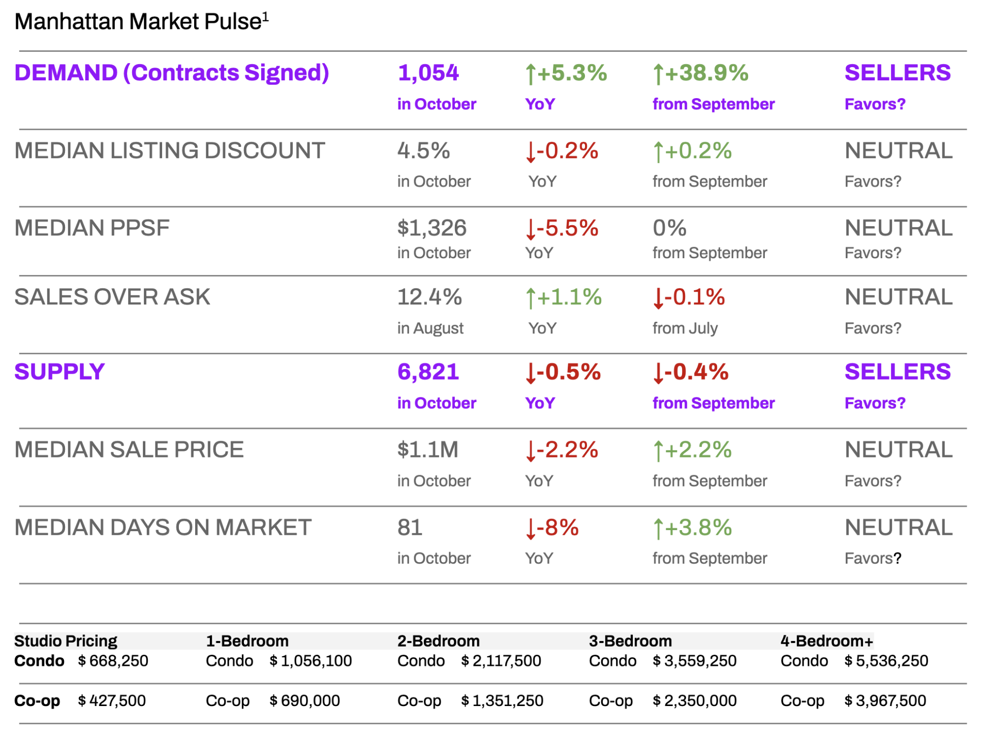 Manhattan’s active inventory contracted slightly in October, ending the month at approximately 6,821 listings (about –0.4% from September and –0.5% year-over-year). This modest dip in supply, coming right before the holidays, means buyers had even fewer options to choose from.