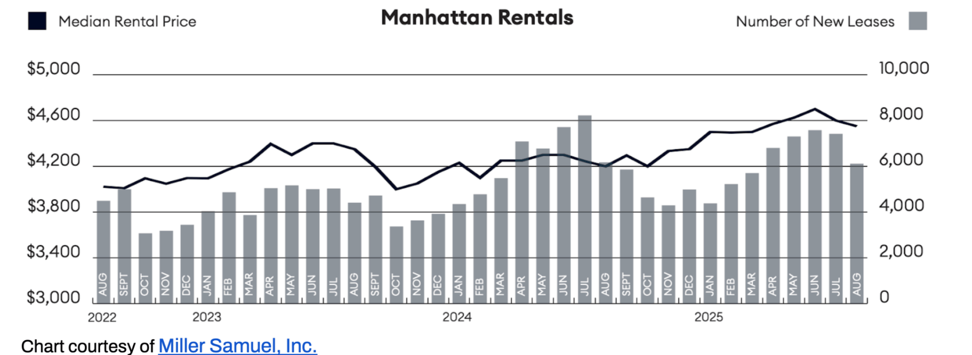 Manhattan’s rental market remains near historic highs even after a slight late-season breather. In September 2025 (the latest data available), the median rent in Manhattan was about $4,550, which is down a slight 1.1% from August’s all-time peak but still 8.3% higher than a year earlier³.