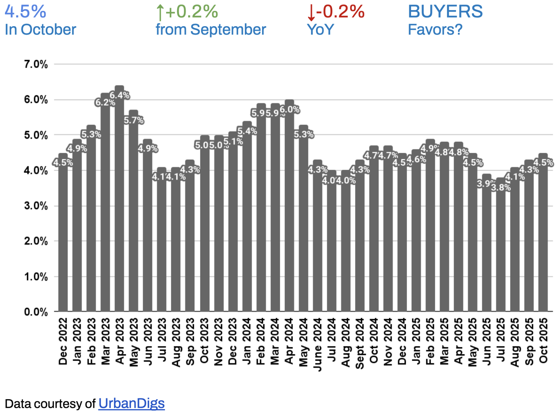 We anticipate a quieter final two months of 2025. Looking further out, the fact that contract activity was up year-over-year in October (+5.3% YoY) is a positive sign for underlying demand going into 2026. Barring any economic shocks, buyer interest should remain relatively healthy next year – but expect a slow start in the deep winter before the market wakes up for the spring cycle.