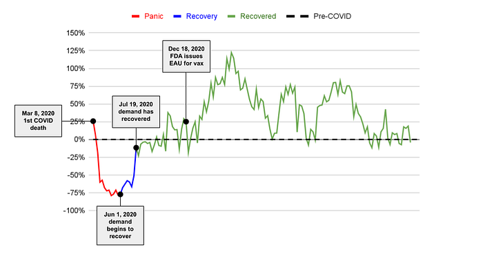On March 8, 2020, the first death from COVID was reported. By the end of May — not surprisingly — demand* for NYC was down -78% from its pre-pandemic average**.