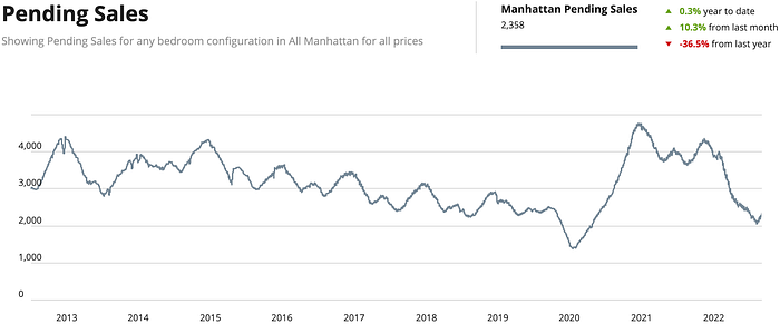 Manhattan Pending Sales: Like the supply “almanac,” the pending sales chart provides us with a very clear picture of what to expect. Any deviation from the large peak in June and smaller peak in December would certainly qualify as “news” and be reported. As expected, the metric increased this week from 2,240 to 2,358.