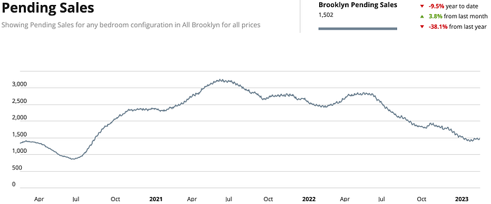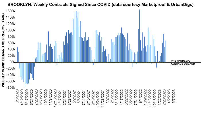 Brooklyn Contracts Signed: Brooklyn is peaking for the 6th consecutive time since the pandemic. After briefly touching the pre-pandemic average in mid-January, which has become the metric’s support level for the past two years, signed contracts have skyrocketed above that average. This week, 127 contracts were signed.