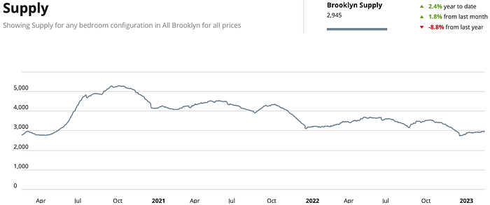 Brooklyn Supply, without Manhattan’s depth of historical data to clearly illustrate the trend, still exhibits a bi-annual supply cycle. Although new supply increased this week to 197 units, total supply was down ever so slightly to 2,945 units, but the metric’s trend is still in the direction of a June peak.