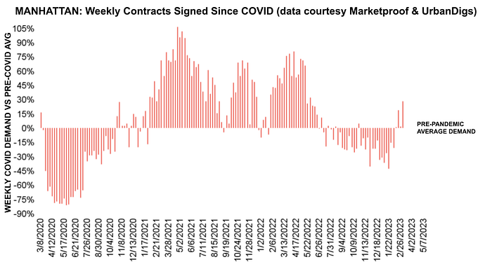 Manhattan Contracts Signed: After spending most of the past seven months under the historical average, demand for Manhattan has now remained above that average for the past four weeks. This week, 233 contracts were signed.