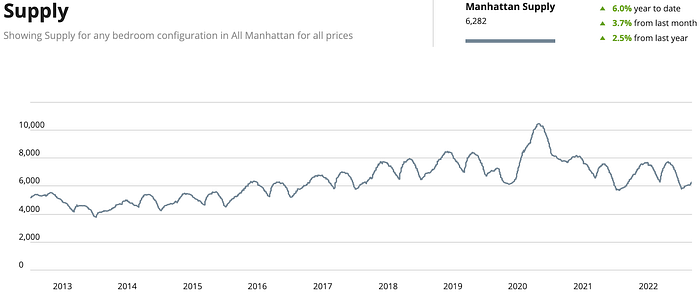 Manhattan Supply: The chart below serves as an almanac, suggesting what we can expect. Spring’s supply increase is more gradual en route to the June peak, whereas fall’s bounce to the October peak is much more abrupt. Not surprisingly, the metric was up again this week to 6,282 units, including the 439 new listings that were posted.