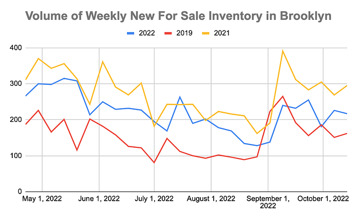 Brooklyn Supply was slightly higher this week with 3,485 units for sale, 217 of which were new to market. The number of new listings is 4% less than last week but 34% more than the same week in 2019.