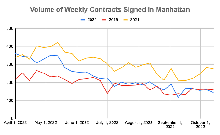 Manhattan Contracts Signed — 145 contracts were signed this week, a 10% dip from both last week’s number and the same week in 2019. This is the first week that the contract signed activity has fallen significantly below 2019’s level. We’ll continue to monitor if this is a blip, or the start of a new downward trend.
