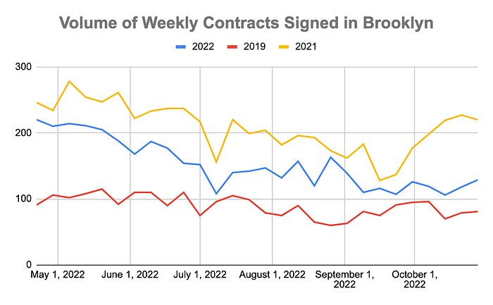 Brooklyn Contracts Signed — 129 contracts were signed this week, a +9% increase over last week, a +51% increase from the same week in 2019 and an approximately +100% increase compared to the average of the 5-year period preceding the pandemic.