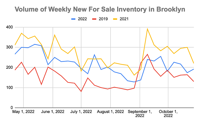 Brooklyn Supply held steady this week at 3,517 units for sale, despite a 10% increase of new listings coming to market. Of course, this means that more contracts were signed this week than last. Those 192 new listings are –13% lower than the same week last year and +48% higher than the same week in 2019.
