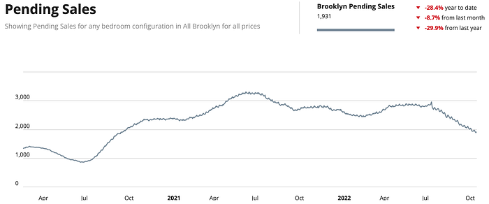 Brooklyn Pending Sales decreased again by 2% to 1,931, and are lower by –30% from this time last year.