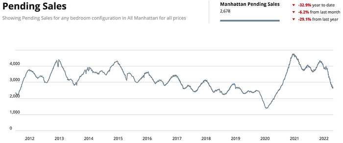 Manhattan Pending Sales decreased slightly again this week to 2,678, the lowest level since January 8, 2021.