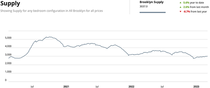 Brooklyn Supply also exhibits a bi-annual cycle, though it’s not as apparent without Manhattan’s depth of historical data to clearly illustrate the trend. As we expected, the metric increased this week from 3,005 to 3,037 units, including new listings up from 192 to 222.