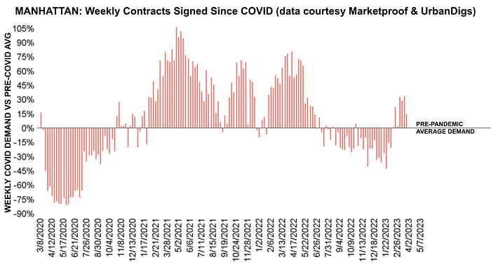 Manhattan Contracts Signed: After spending July 2022 to January 2023 below the historical average (the average weekly number of signed contracts from Jan 5, 2015, to Mar 1, 2020), demand for Manhattan has now remained above that average for the past seven weeks. This week, signed contracts decreased from 274 to 235.