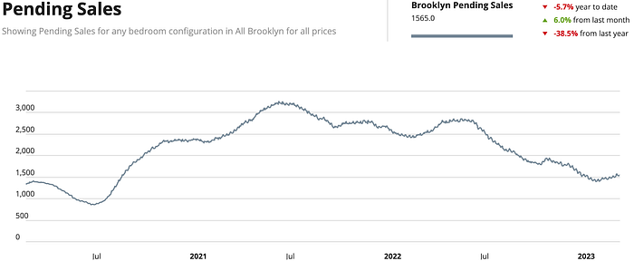 Brooklyn Pending Sales: This week’s observation is the same as what we witnessed in Manhattan where, right on cue, the metric reached its seasonal February trough and then reversed direction. We can also predict that the first of two peaks this year should occur in June. This week, the metric increased from 1,541 to 1,565 units.
