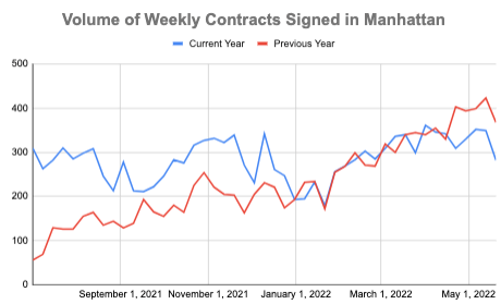 Manhattan Contracts Signed -282 contracts were signed this week, the first week contract activity dipped below 300 in twelve weeks. This represents a 19% decrease from last week and a 23% decrease from the same week last year. At this same time last year, a similar drop in contract activity from the week prior occurred as well. This is the fifth week in a row where this year’s contract activity fell below the volume of the same week last year.