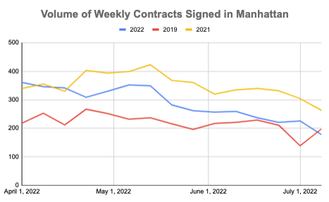Manhattan Contracts Signed — 178 contracts were signed this week. This represents a 21% decrease from last week and a 10% decrease from the same week in 2019. The July 4th holiday contributed to some of the decline this week, although this week had the fewest contracts signed since the week ending January 22, 2021. This is also the first week this year where contract volume on a weekly basis has fallen below 2019’s level.