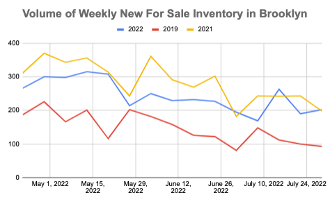 Brooklyn Supply: Last week 202 new listings came to market in Brooklyn, an increase of 6% compared to last week and 117% more than the same week in 2019.