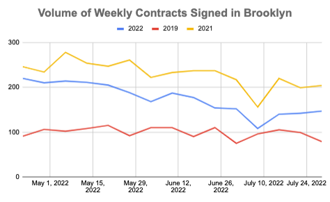 Brooklyn Contracts Signed — 147 contracts were signed this week. This represents a 3% increase from last week and an 86% increase from the same week in 2019.