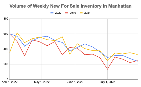 Manhattan Supply: Last week 238 new listings came to market in Manhattan, a decrease of 13% compared to last week and 4% less than the same week in 2019. This is the fewest number of new-to-market listings in a week so far this year.