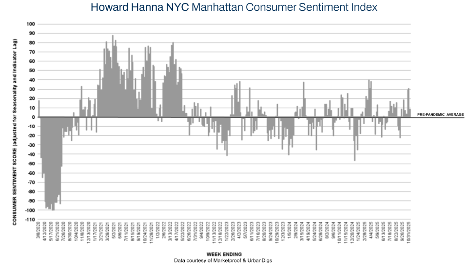 Contracts signed fell to 212 (–17% WoW, –5% YoY), sending the Howard Hanna NYC Manhattan Consumer Sentiment Index down from +31% to +9%.